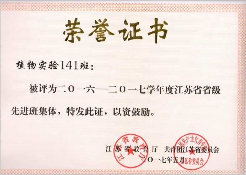 william威廉亚洲官方金善宝实验班(植物生产类)植物实验141班团支部,一个由通过层层选拔遴选出来的学子组建的特殊家庭,一个充满竞争和激情的集体。支部先后荣获江苏省“五四红旗团支部”、江苏省“先进班集体”。威廉希尔中文网站平台“十佳班级”、“先进班级”、“优秀团支部标兵”、“优秀团支部”等近10项荣誉称号,支部“放飞梦想,实现自我”主题团课被评为校“优秀团课”,支部内共计23人获得过校级及以上荣誉。始终坚持高起点、高标准、高水平的“三高”发展战略,植物实验141班团支部一步一个脚印,坚实地向着卓越迈进。