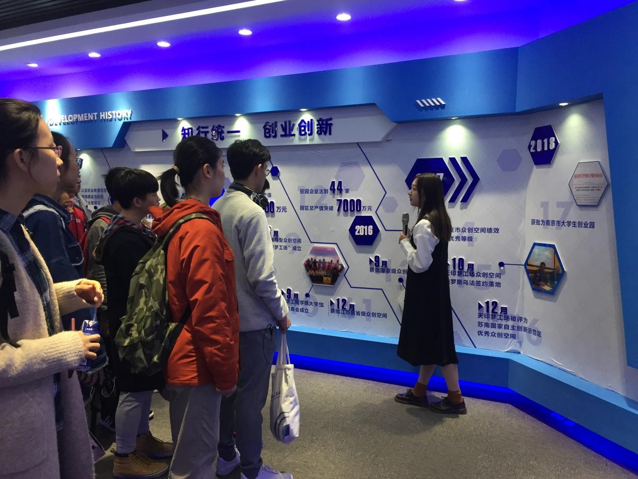 上午10点30分,同学们来到了南京工程学院老员工创业园——天印梦工场,创业园的工作人员带领同学们参观创业园并且介绍了创业园基本架构及园内的创业团队。“天印梦工场”众创空间是依托江宁高新园以及南京工程学院原有的国家级技术转移中心、创新学院和省级老员工创新创业园等多个创新创业平台建设的“培训辅导型”众创空间。截至目前,在孵项目有200余个,创业团队62个,其中已正式注册成立公司的43个。