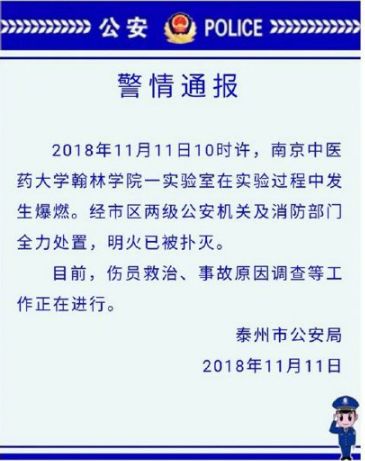 翰林学院发生爆燃:11 月 11 日上午 10 点左右,南京中医药大学翰林学院一实验室在实验过程中发生爆燃。现代快报记者获悉,市区两级公安机关和消防部门全力处置,明火很快被扑灭。据了解,事故发生后,强烈的冲击波将实验室大门炸飞,玻璃渣更是到处都是,而当时身处实验室内的多名师生受伤。目前,伤员救治、事故原因调查等工作正在进行。11日下午1点多,江苏省泰州市公安局发布警情通报